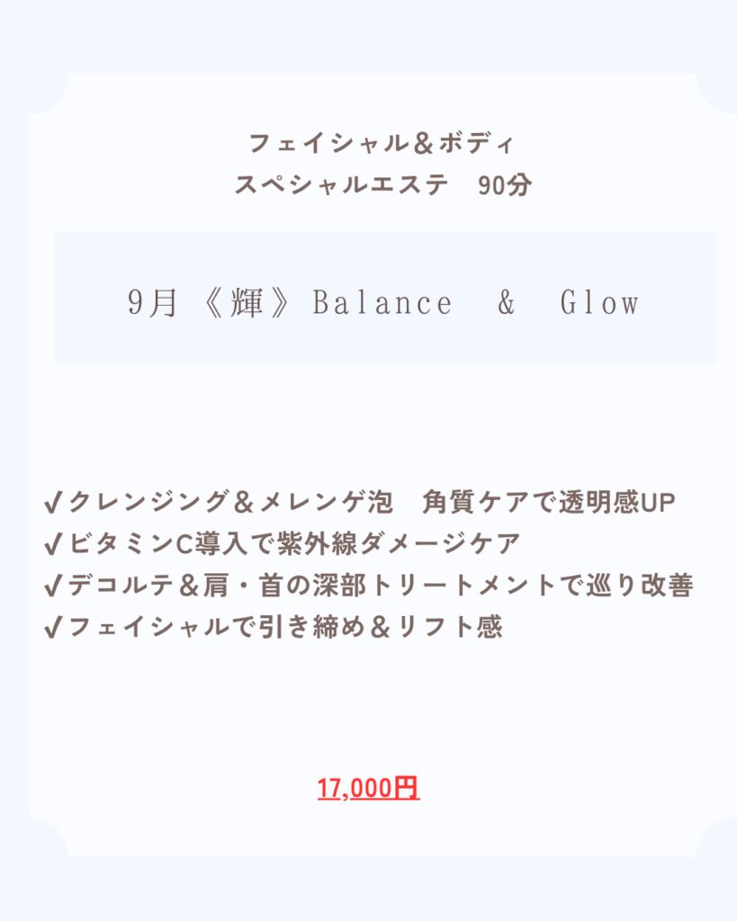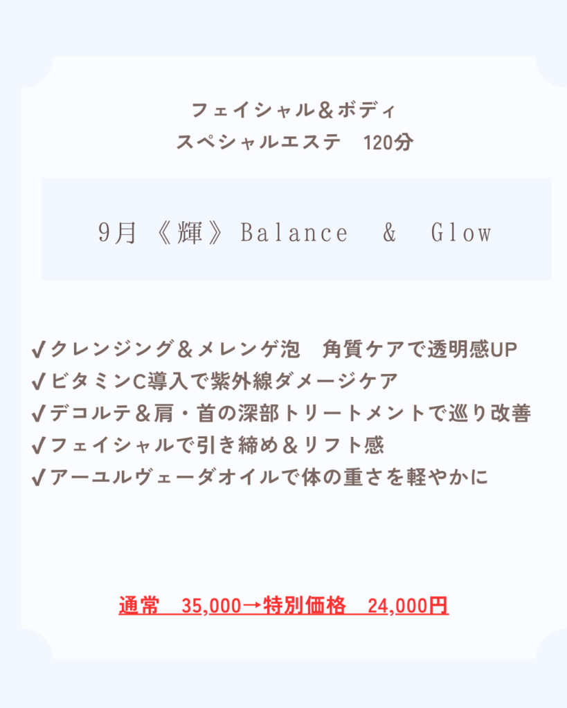 【9月限定】《輝 -balance & grow-》~夏疲れを癒し、秋を迎える肌と心のケア~ 秋肌準備はできていますか?透明感とハリをチャージ✨